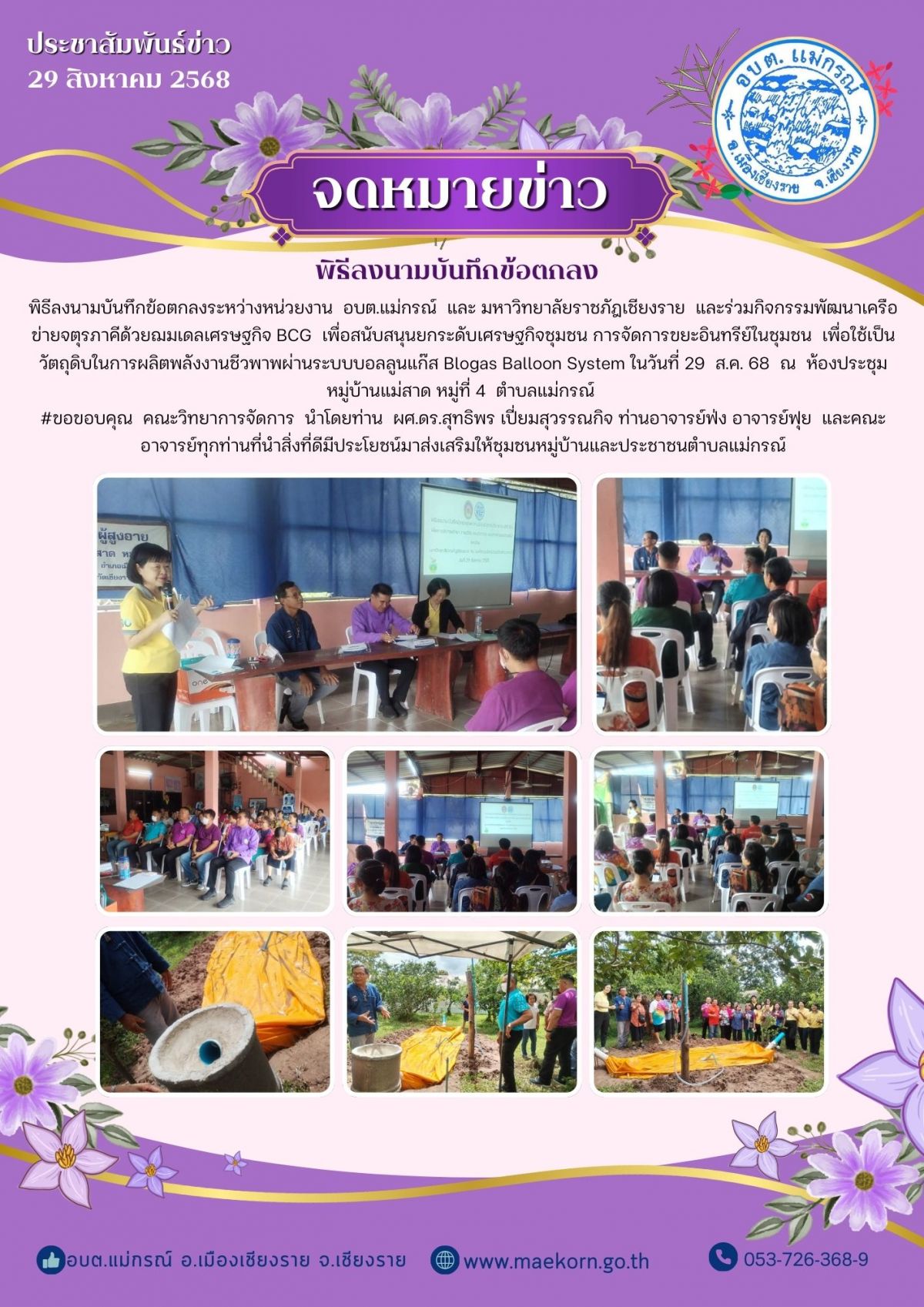 Open sidebar พิธีลงนามบันทึกข้อตกลงระหว่างหน่วยงาน อบต.แม่กรณ์ และ มหาวิทยาลัยราชภัฎเชียงราย และร่วมกิจกรรมพัฒนาเครือข่ายจตุรภาคีด้วยฌมเดลเศรษฐกิจ BCG 17 29 สิงหาคม 2568 [ 14:23 น. ] ย้อนกลับ พิธีลงนามบันทึกข้อตกลงระหว่างหน่วยงาน อบต.แม่กรณ์ และ มหาวิทยาลัยราชภัฎเชียงราย และร่วมกิจกรรมพัฒนาเครือข่ายจตุรภาคีด้วยโมเดลเศรษฐกิจ BCG เพื่อสนับสนุนยกระดับเศรษฐกิจชุมชน การจัดการขยะอินทรีย์ในชุมชน เพื่อใช้เป็นวัตถุดิบในการผลิตพลังงานชีวพาพผ่านระบบบอลลูนแก๊ส Blogas Balloon System ในวันที่ 29 ส.ค. 68 ณ ห้องประชุม หมู่บ้านแม่สาด หมู่ที่ 4 ตำบลแม่กรณ์ #ขอขอบคุณ คณะวิทยาการจัดการ นำโดยท่าน ผศ.ดร.สุทธิพร เปี่ยมสุวรรณกิจ ท่านอาจารย์ฟ่ง อาจารย์ฟุย และคณะอาจารย์ทุกท่านที่นำสิ่งที่ดีมีประโยชน์มาส่งเสริมให้ชุมชนหมู่บ้านและประชาชนตำบลแม่กรณ์ ย้อนกลับ